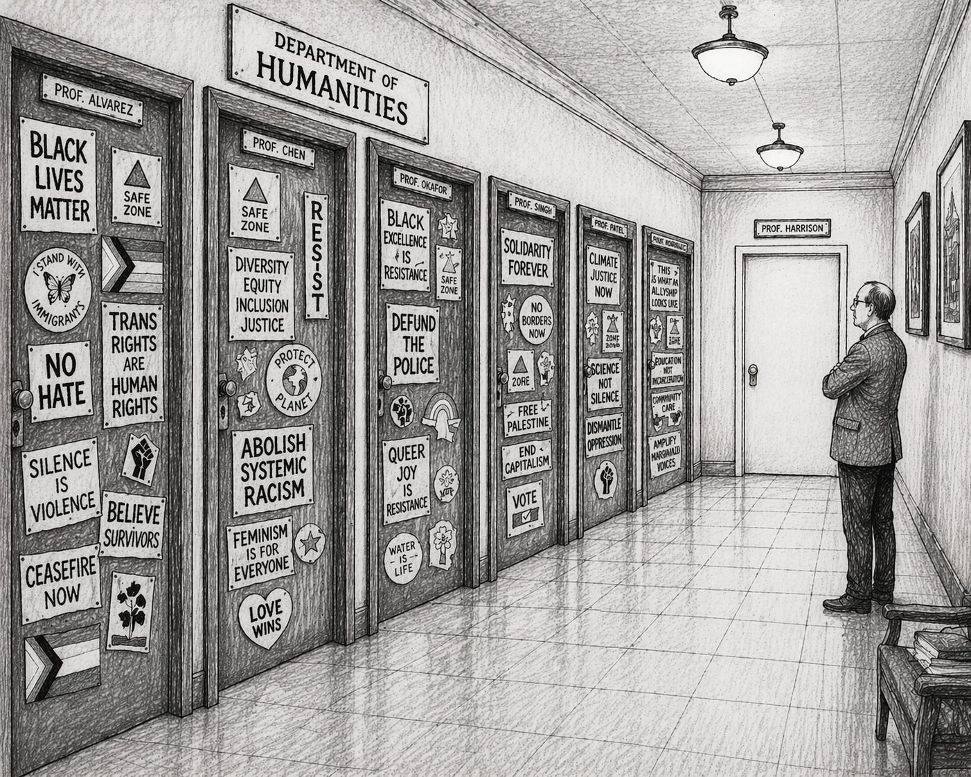 Walk down any hallway in my building and you’ll see them. Safe Zone stickers — the official insignia of faculty who have completed LGBTQ+ ally training — alongside progressive cause posters and the full iconography of a campus that takes one kind of inclusion seriously. The doors are a bulletin board of approved politics.