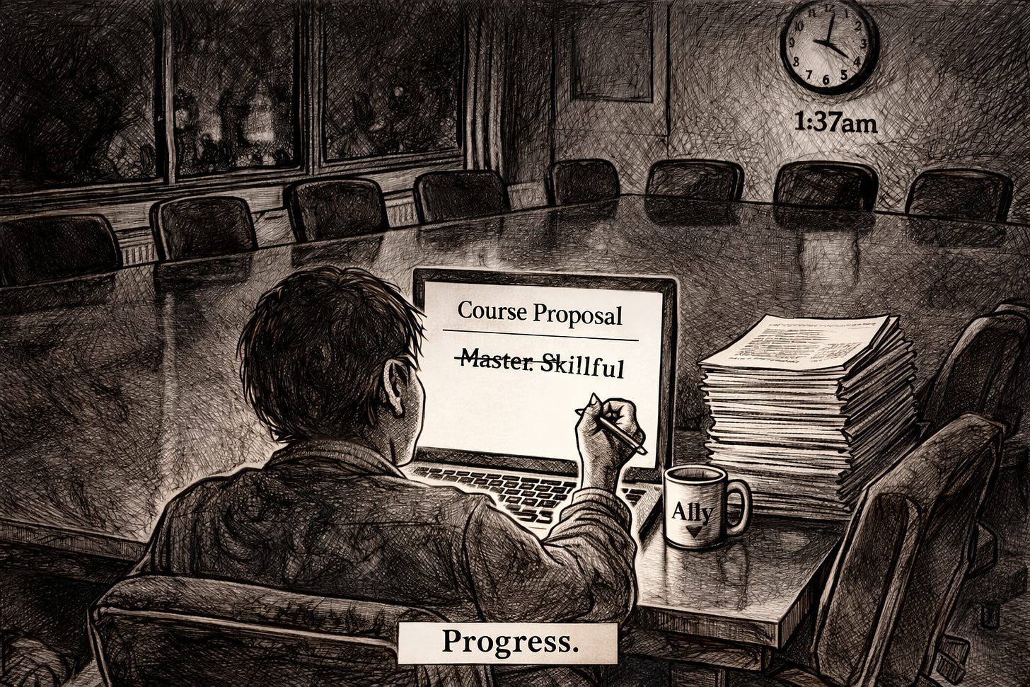This is a curriculum committee. Its job is to evaluate pedagogy, learning outcomes, and course rigor. Instead, at 1:37 in the morning, a member was not parsing standard accreditation language for hidden subtext.