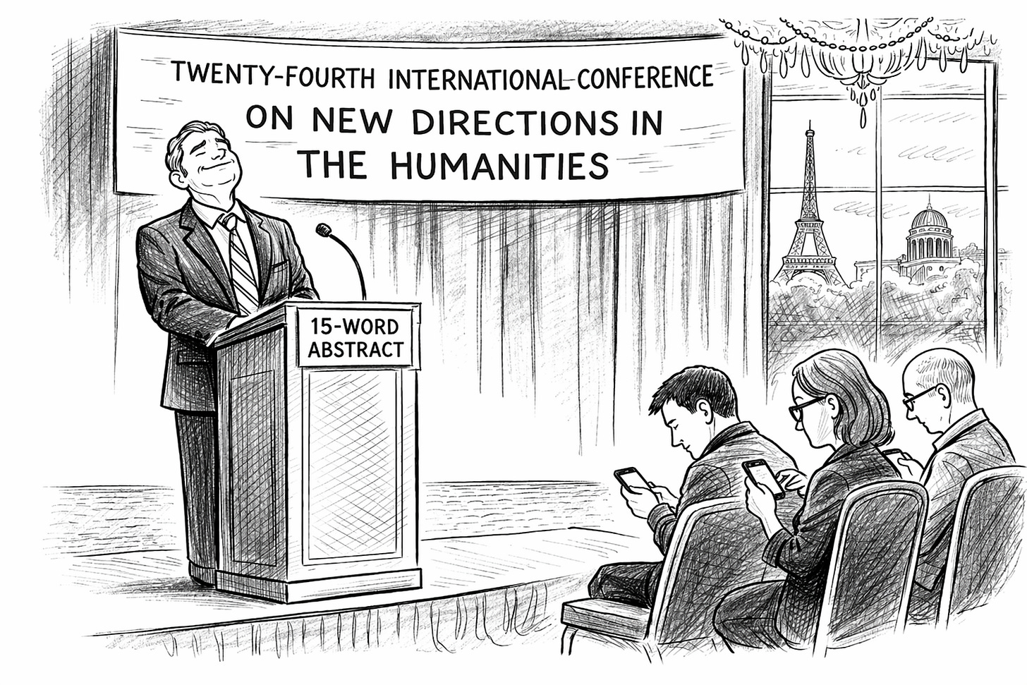 There are genuinely valuable academic conferences. I’ve been to those too. A regional conference I attended early in my career charged around $50 — which included membership in the organization and access to its publications for a year. It was held in the kind of city that does not appear on anyone’s travel bucket list. Toledo. Birmingham. Harrisburg. The sort of mid-sized American city with a perfectly adequate convention hotel and no particular reason to extend your stay. My university covered the registration fee and meals. I presented a paper that wasn’t quite ready. The conference chair had written out detailed, handwritten feedback on my paper — not a form letter, not a generic “interesting work,” but specific, pointed observations about my argument and methodology. I went home and rewrote the paper substantially. It was eventually published in a peer-reviewed journal that people actually read and it’s been cited many times in other academic research and even mainstream news stories.