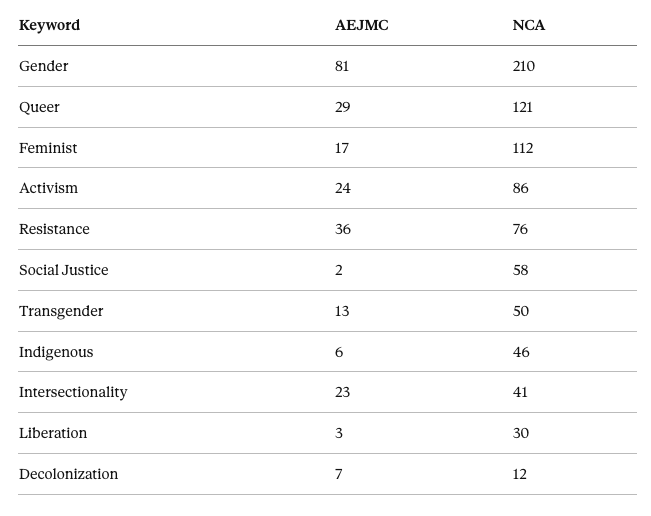 At NCA — the larger conference, covering communication broadly — the numbers are worse. “Resistance” appears 76 times. “Queer” 121 times. “Feminist” 112 times. “Activism” 86 times. “Social justice” 58 times. “Liberation” 30 times. “Decoloni” 12 times.